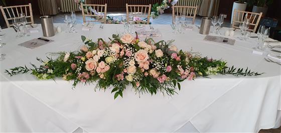 Elegant top table flowers designed to create a stunning focal point for your wedding reception, styled with soft colour harmony and natural movement.