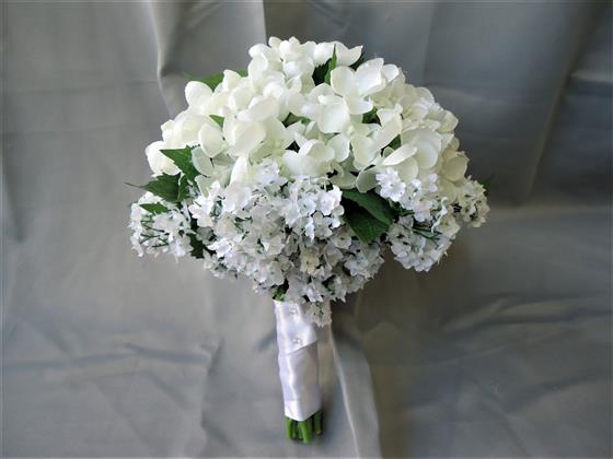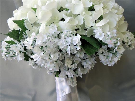 A pretty white bridal posy made using artificial white hydrangea and gypsophilia, tied with a satin ribbon handle.