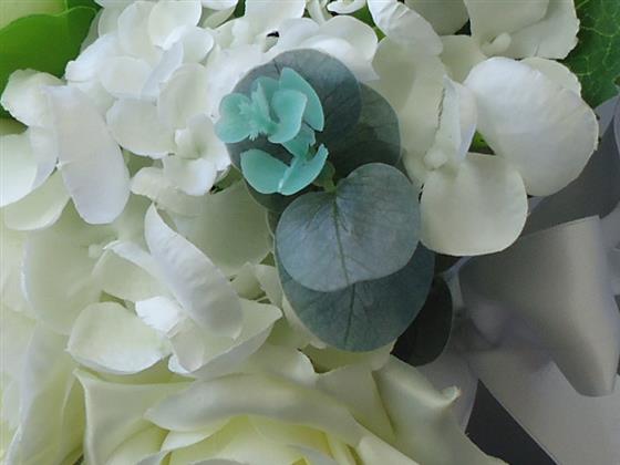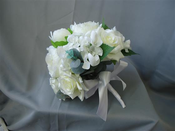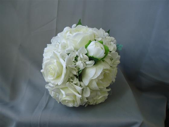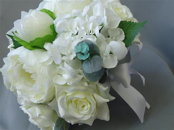 An artificial bridal posy made using ivory roses, hydrangea and peonies, with a satin handle and bow