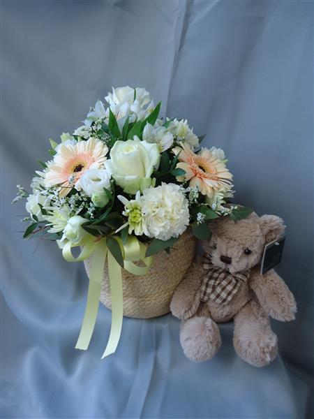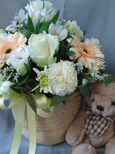 A pretty neutral shades arrangement to celebrate the arrival of a new baby, accompanied with a cute teddy bear which is suitable for a new born
