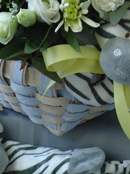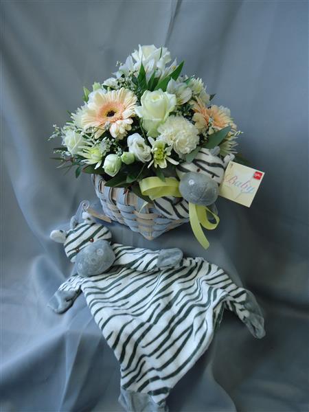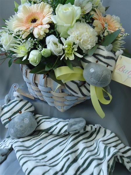 A cute set to celebrate the birth of a baby, a stylish basket is filled with flowers in neutral shades with the addition of a cute baby zebra rattle and a plush zebra snuggle blanket