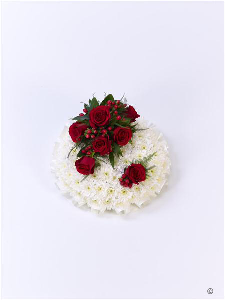 A classic posy design created using a mass of white double spray chrysanthemums and completed with a spray of red roses, French ruscus and hypericum berries. the item shown designed on a 10" (25cm) posy This design is also available in larger sizes
