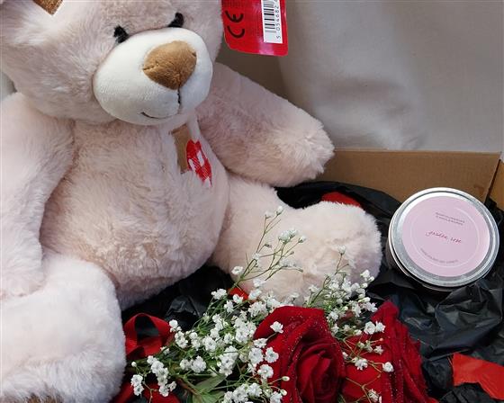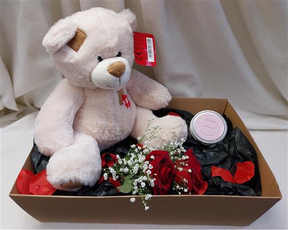 A cute and cuddly patch heart teddy, delivered in a gift box decorated with artificial rose petals with 2 fresh large headed red roses tied with gypsophilia and a garden rose scented soy candle tin