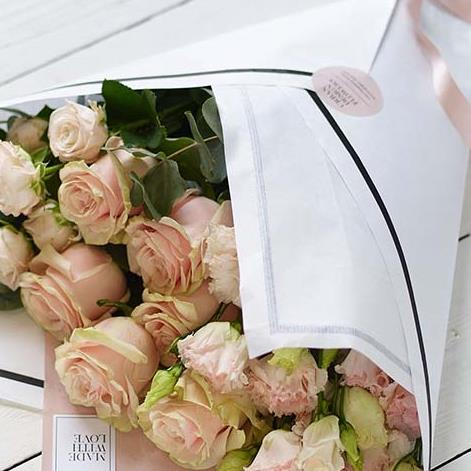 A collection of stunning pink flowers in a sleek white gift wrap. A marvel of minimalism, all ready for arranging so they suit a space perfectly.