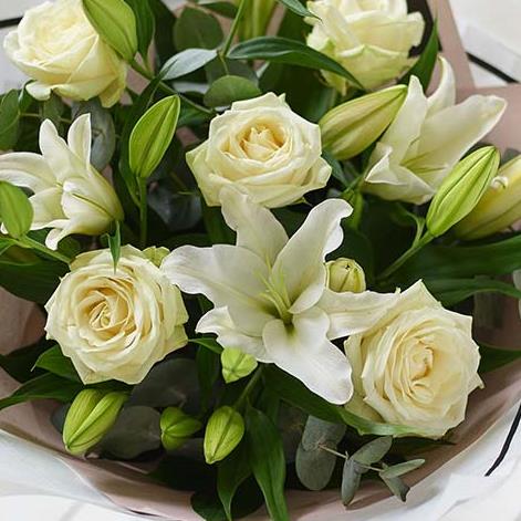 A soothing bouquet of white roses and lilies. Elegant and graceful.