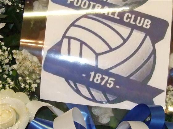 This blue and white wreath is designed for a Birmingham City fan,with the badge in the centre of the wreath ,made using white roses, gypsophilia,white carnations and chrysanthemums, with the addition of blue and white ribbon to compliment the colour scheme.approximate size 16" across. Other football team logos and colours can be made.