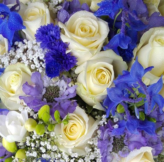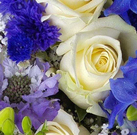 This is a beautiful summer bouquet in shades of blue an lilac, containing, roses delphinium,cornflowers and scabious. Due to the flower content this bouquet is only available during June, July and August.