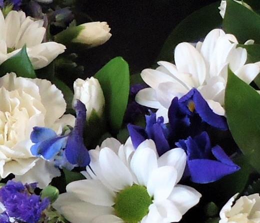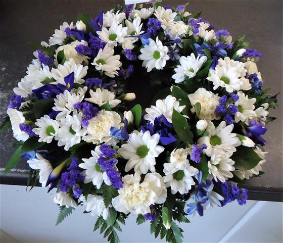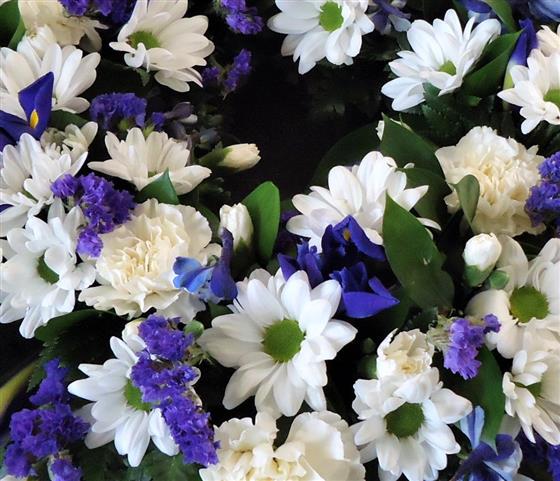 A classic selection of flowers including irises, carnations and spray chrysanthemums in blues, purples and whites are nestled into this traditional circular wreath. The design shown is made using a 12" wreath ring , other sizes are available