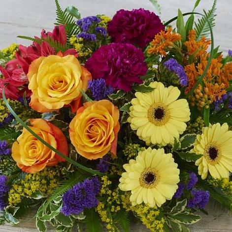 A cluster of vibrant flowers designed using roses carnations and germini with mixed foliage and grasses Standard size shown