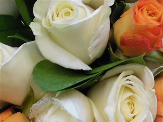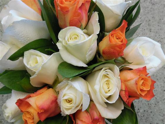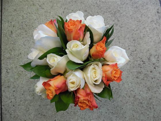 A selection of Mariyo Roses Avalanche roses and ruscus tied together and finished with an ivory voile ribbon, this bouquet is suitable for an adult bridemaid ,it is approximately 20cm across and is designed to compliment the calla lily and rose handtied for the bride,