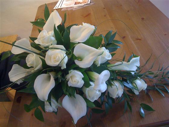This design is suitable for a top table or Registrar table and is designed to be more front facing using white Calla lilies and white roses with ruscus and beargrass, the design is approximately 55cm long x 35cm wide x 30cm tall and can be made using other colours