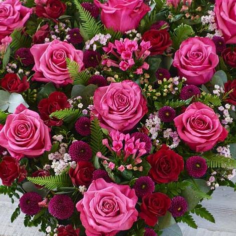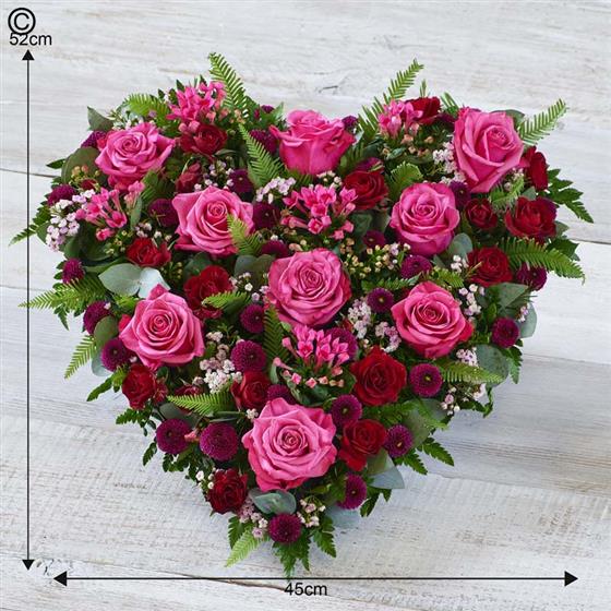 A beautiful heart made using cerise roses and red spray roses, waxflower and bouvardia with mixed foliage.