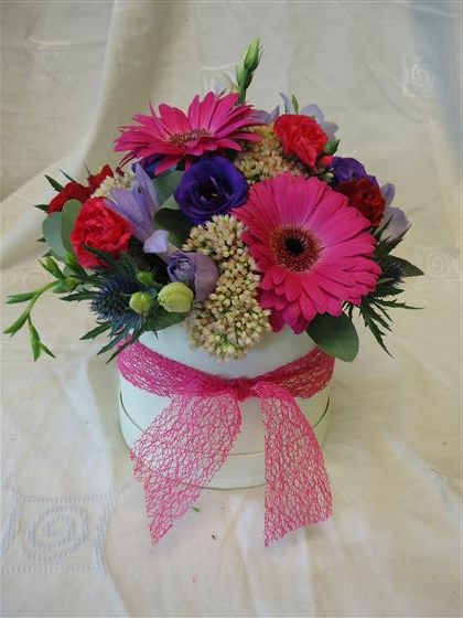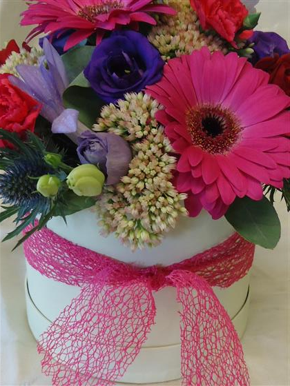 A colourful ,cheery hatbox using cerise, purple and lilac shades