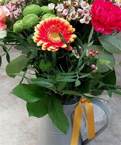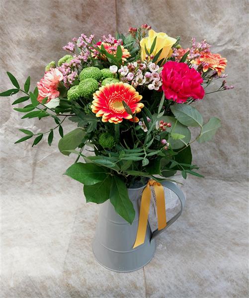 A stylish painted zinc jug packed with flowers in zingy citrus shades and hot pink includes a rose, germini and chrysanthemums with seasonal foliage