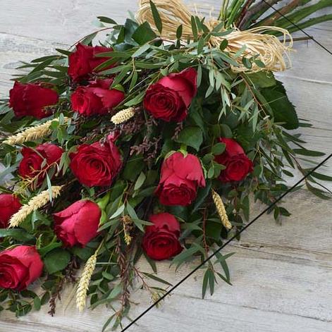!2 large headed red roses with mixed foliage including Eucalyptus, with wheat and birch, tied with a raffia bow to create this environmentally friendly design