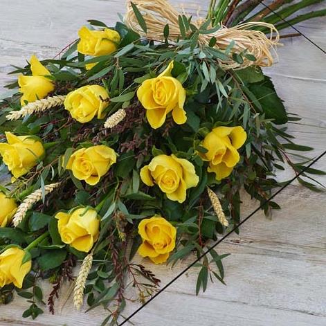 !2 large headed yellow roses with mixed foliage including Eucalyptus, with wheat and birch, tied with a raffia bow to create this environmentally friendly design