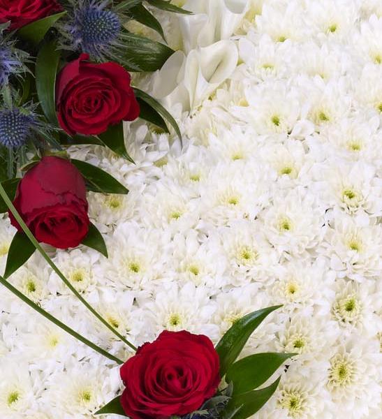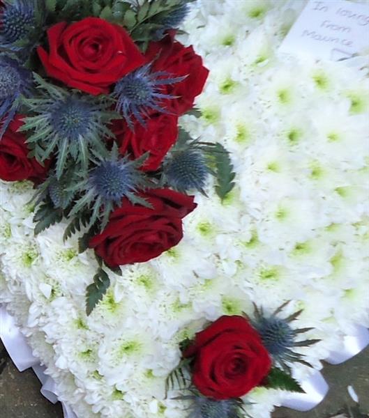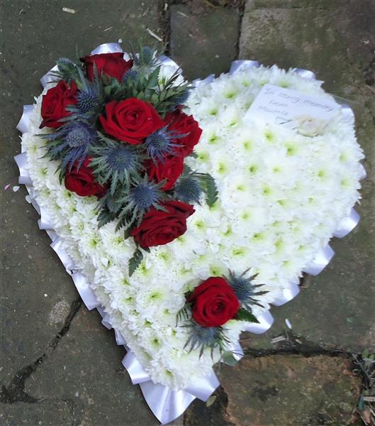A classic heart-shaped design covered with a mass of white double spray chysanthemums and finished with a spray of red large-headed roses, eryngium and ruscus. 15" size shown