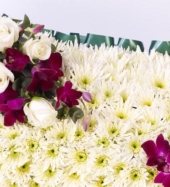A classic pillow-shaped design created using a mass of white double spray chrysanthemums and finished with a spray of white and purple flowers.spray may vary due to seasonal availability of orchids. 15" size shown. If you would like the design made in a different colour please phone the shop and we will advise you .