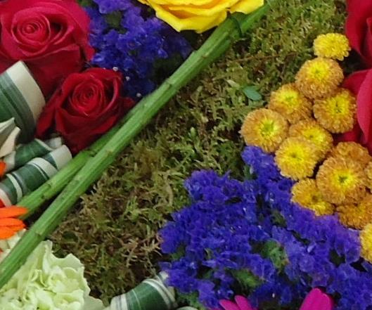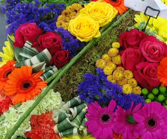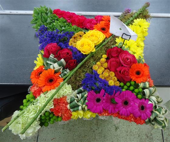 This striking contemporary cushion-shaped design features a selection of flowers in vibrant yellow, orange, purple and pink and includes roses, germini, carnations and statice. The design is completed with sweeping calla Lily and veronica. one size only 18" (45cm)