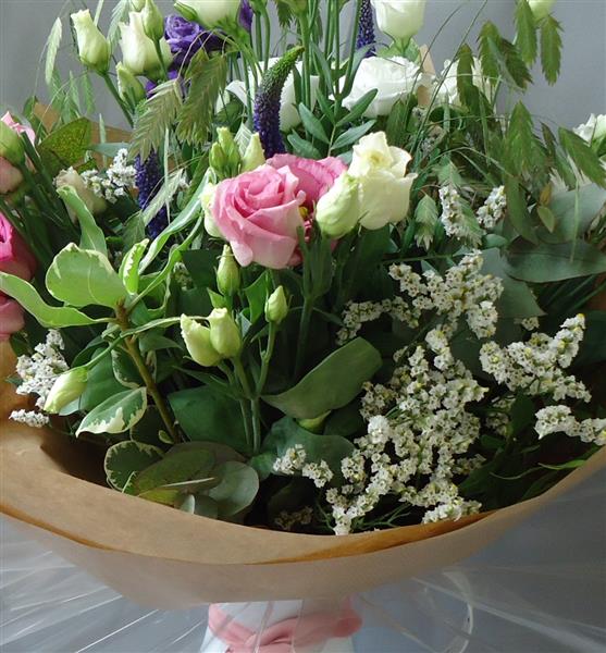 A painted zinc jug filled with pretty and delicate Lisianthus, veronica, limonium and grasses wrapped in eco friendly kraft paper wrap