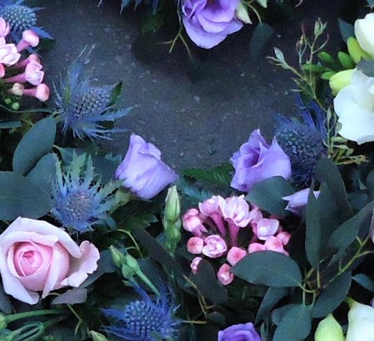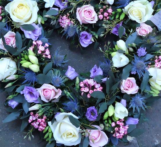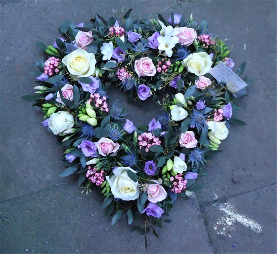 This country style heart includes Pink and white roses, white freesia, Lisianthus, Thistle, Bouvardia and assorted seasonal foliage 15" size