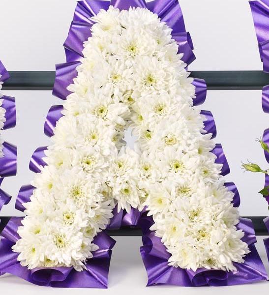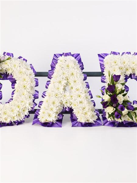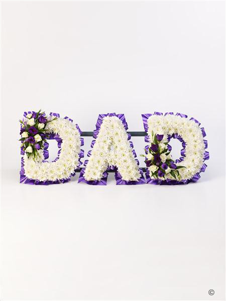 A mass of white double spray chrysanthemums is finished with delicate sprays of roses and lisianthus in white and purple to create this Dad tribute. Other colour combinations are available