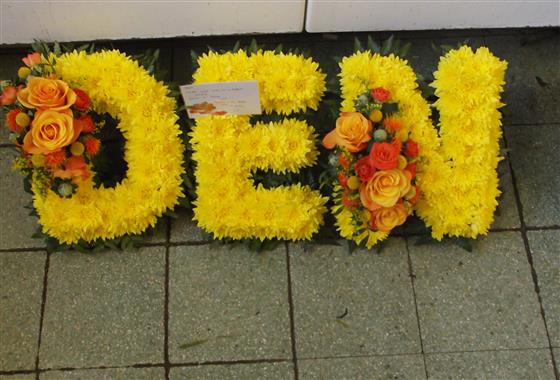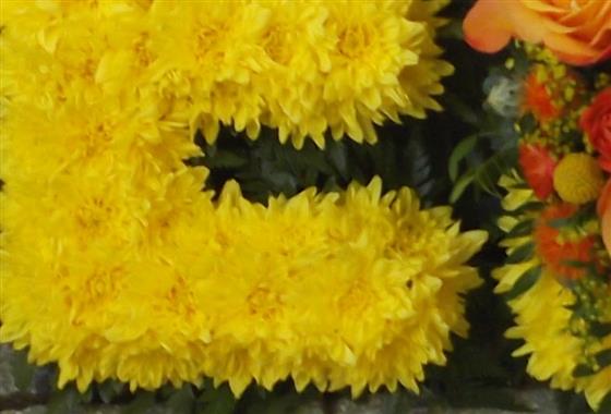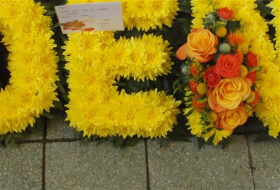 This vibrant mix of colours, based in yellow chrysanthemums and orange rose sprays. Other names and colours available, please phone the shop for advice on availability