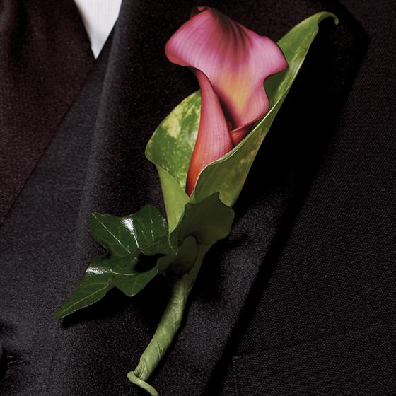 This exquisite buttonhole gives that special finishing touch to a wedding outfit. featuring a pink calla lily and foliage