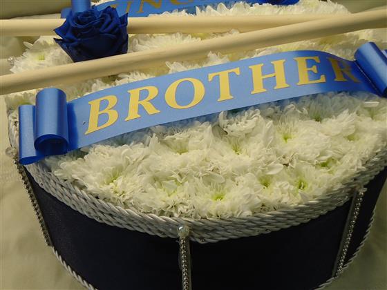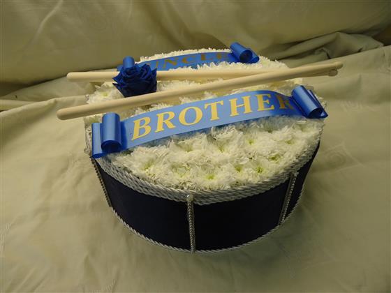 A drum design, with name ribbons and drumsticks. Other colours are available for the rose