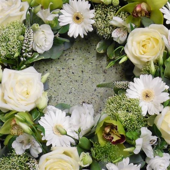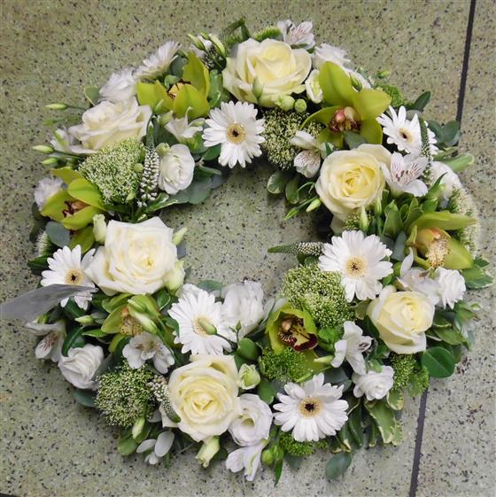 An elegant wreath featuring a selection of white and green flowers featuring orchids and roses. 14" size shown. Flowers may vary due to availability
