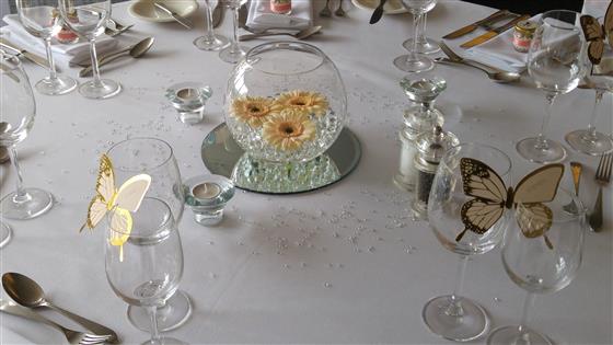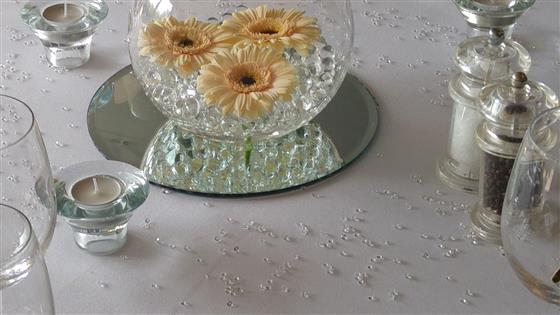 A simple table design of water pearls with germini heads floating on the top, this design includes the vase, can be made using different coloured germini