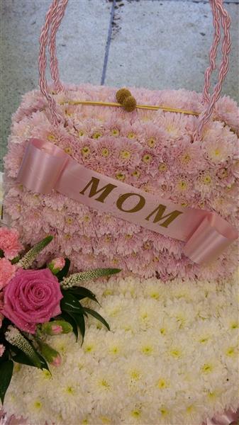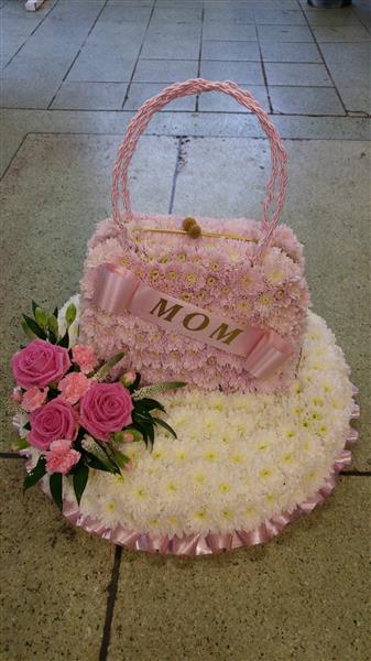 This pretty handbag design is made using chrysanthemums and is available in other colours, with the addition of a satin rope handle and gold clasps to finish, set on a cushion with a pink rose spray