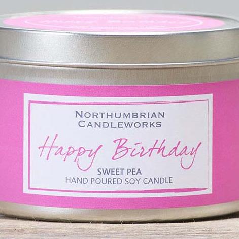 A soy candle gift tin scented with the delicate fragrance of sweetpeas. With a Happy Birthday message on the front of the tin