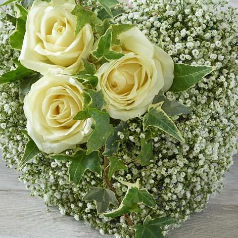 This petite white heart shaped tribute is a simple and very graceful design. Three perfect cream large-headed roses trimmed with variegated Ivy are carefully set on a bed of delicate white gypsophila flowers. 25cm width.
