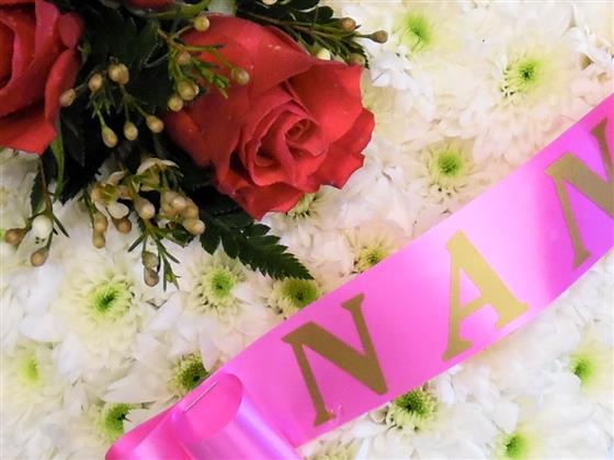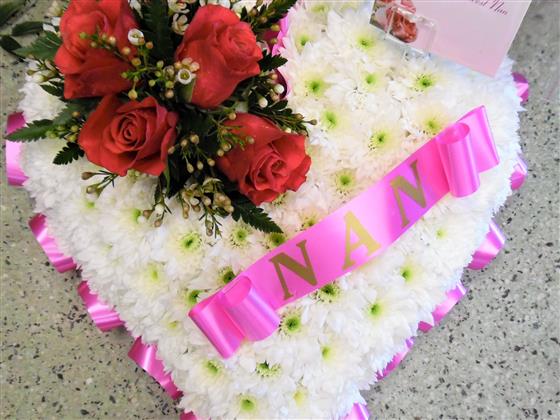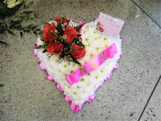 This heart has been designed with a ribbon edge and rose spray with the addition of a name ribbon, available in 3 sizes 15" 18" and 21" Ribbon colour, rose colour and name (maximium of 7 letters) can be customised when ordering