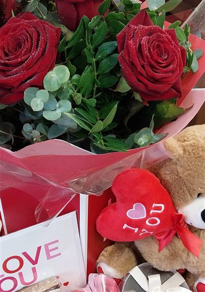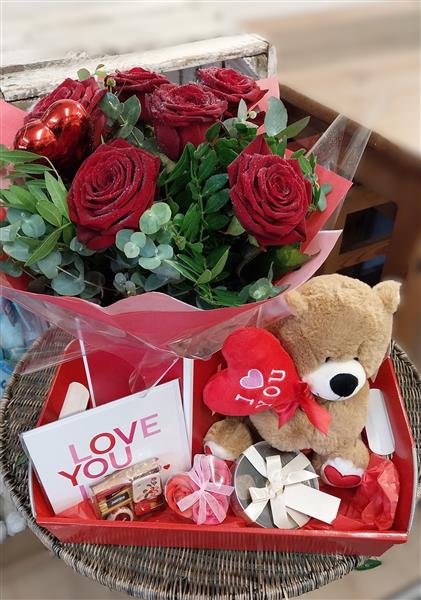 The perfect romantic gesture. A gift box of 6 red roses, cuddly bear, miniature namaste scented sticks and candle, chocolates, scented petal soaps and a Valentines card all presented in a gift box