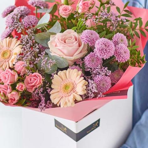 This design contains flowers chosen by expert florists and are tied together and presented in a handtied bouquet with a water bubble and box. The flowers and foliages will vary as each design is a bespoke gift just for you. Available for delivery both Locally and through the Interflora Florist network. Available in 4 colour options, just select your favourite from the drop down box.