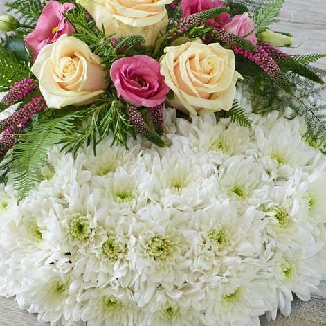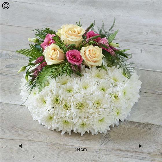 A traditional based chrysanthemum posy with pink roses and lisianthus spray 34cm wide