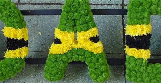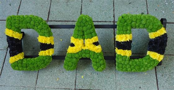 A Dad tribute with the design of the Jamaican flag depicted on the letters.