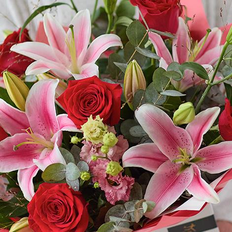 A gorgeous mix of flowers featuring red roses and pink oriental lilies