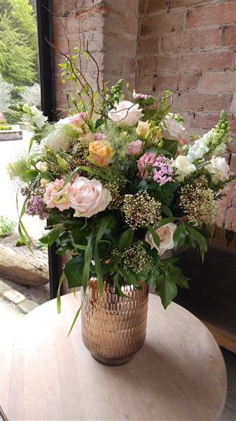 This large vase is filled with a selection of pastel flowers and mixed foliage with a vintage theme, ideal for either a table display or to stand on the floor heigh approximately 90cm tall. Vase may vary due to availability