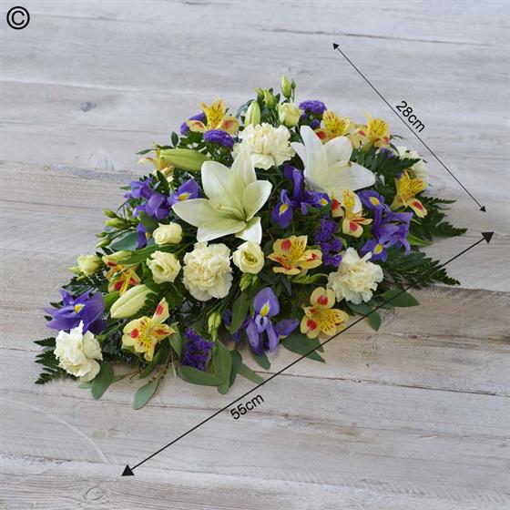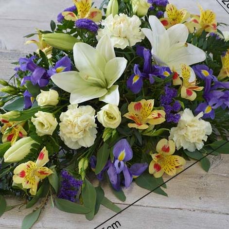 Lemon and blue spray made using carnations ,lilies and Iris available in 3 sizes Standard 55cm long large 60cm long extra large 70cm long