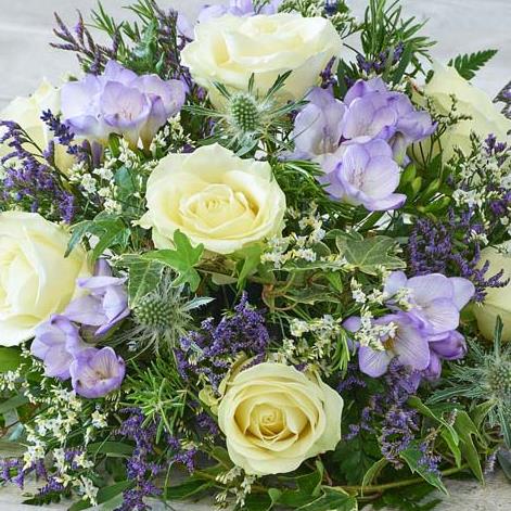A beautiful scented posy including scented freesias, roses and limonium in soft lilac and white. standard size shown
