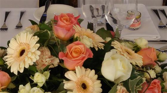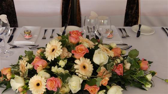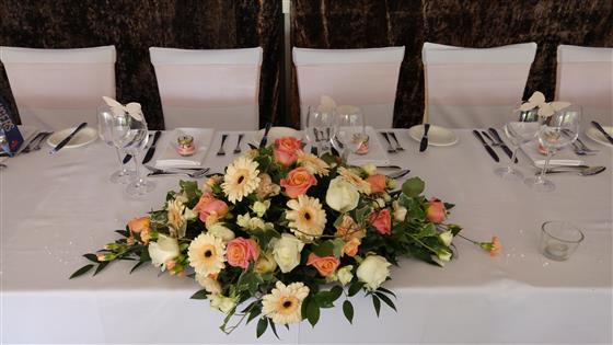 A table arrangement designed to go on the top table, this designed in delicate shades of peach and cream. Other colours available