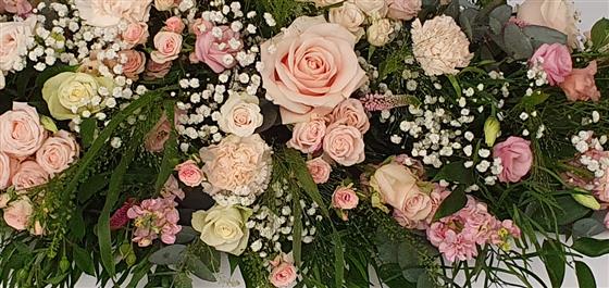 An elegant large top table arrangement in pretty pastel shades. Measuring 122cm long, 40cm wide and 30cm tall