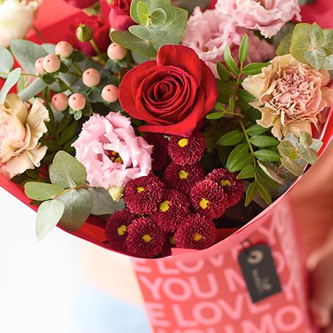 A gorgeous mix of of romantic blooms including a red rose presented in a Valentines themed box