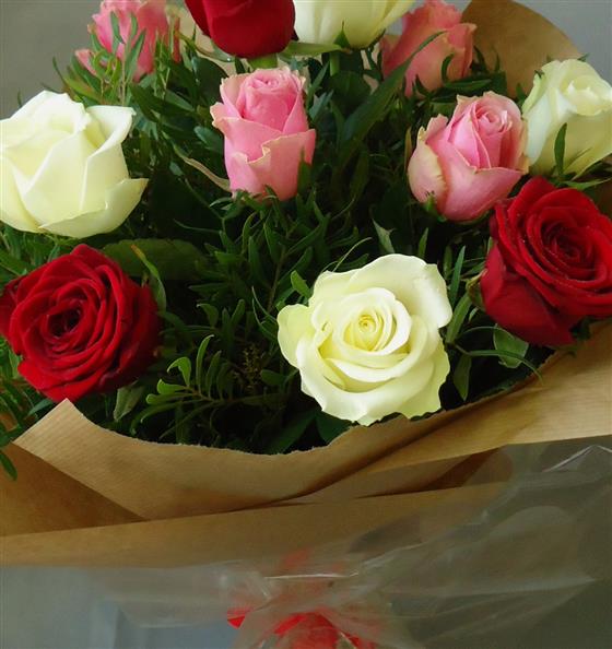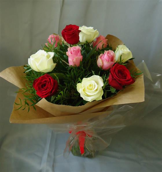 A mixed rose bouquet featuring 4 red,4 white and 4 pink roses tied with foliage and presented in kraft paper wrap and water bubble