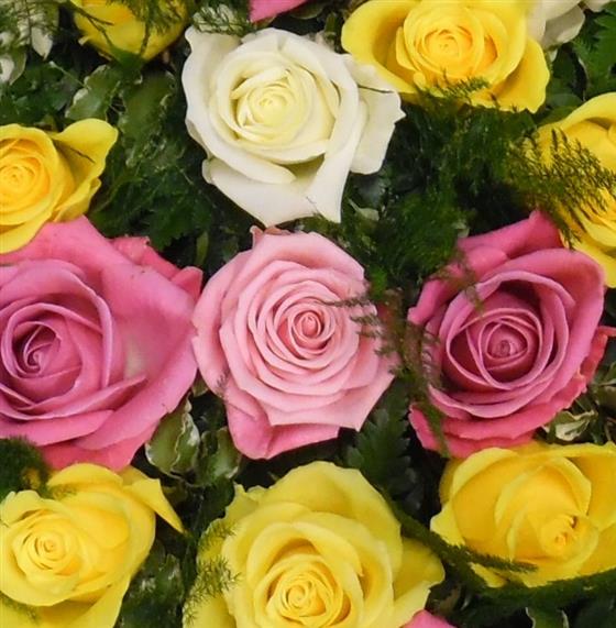 Large-headed roses mixed pastel shades are nestled into an solid heart shape amongst asparagus fern and pittosporum. 15" size shown