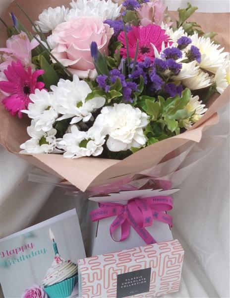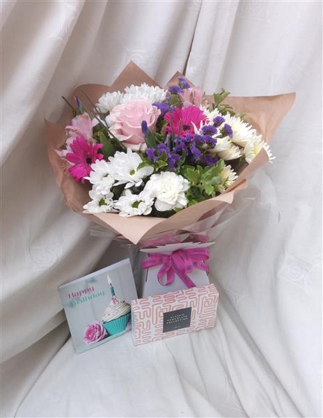 A pretty gift box in pastel shades, embellished with Happy Birthday ribbon and delivered with 99g box assorted chocolates and a Birthday greetings card