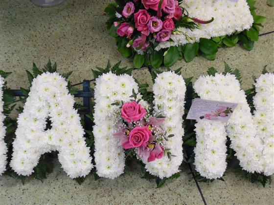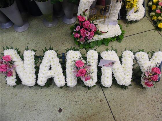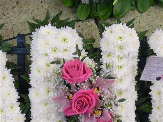 This Nanny frame has been edged with foliage with a white base and pink rose and orchid sprays